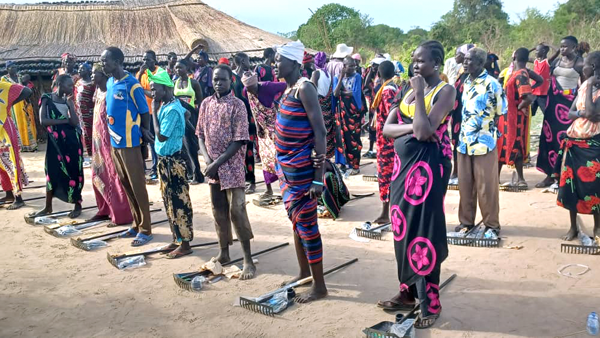 Pictured below is tool distribution among the Mundari tribe at Terekeka. Above is farming instruction. Agape staff will return to check on the anticipated crop to gauge the outcomes of this outreach. Villagers aren’t literate, so we’re providing 2 large Proclaimer audio Bible units.