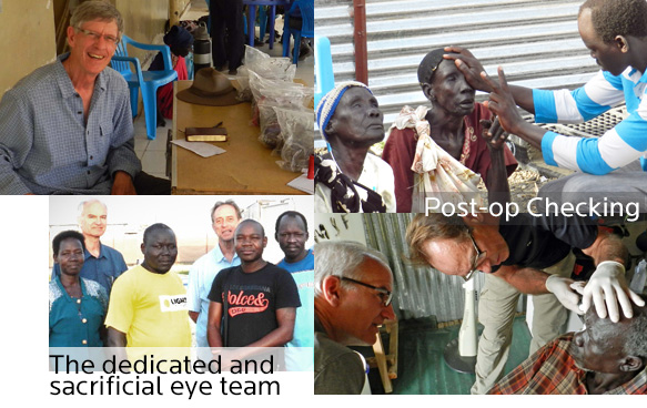 After months of frustrating recruitment, Dr. James Guzek, a cataract surgeon from Richland, WA, responded through the Christian Eye Network. He had wanted to go to S. Sudan for 6 years, but had no network. When he saw the request, he knew that God called him. He had worked in Ghana for three years, had treated trachoma, and knew some Arabic. RMNI then paid S. Sudan trip expenses for Larry Morris, a highly skilled ophthalmic technologist from Pensacola, FL, who was already going to Uganda, forming the core of the medical team. We then hired a cataract surgeon and three eye nurses from the Buluk Eye Center in Juba—the only eye clinic operating in S. Sudan. The S. Sudan embassy in Ethiopia refused visas to 2 Ethiopian eye nurses, whom Dr. Guzek had trained.